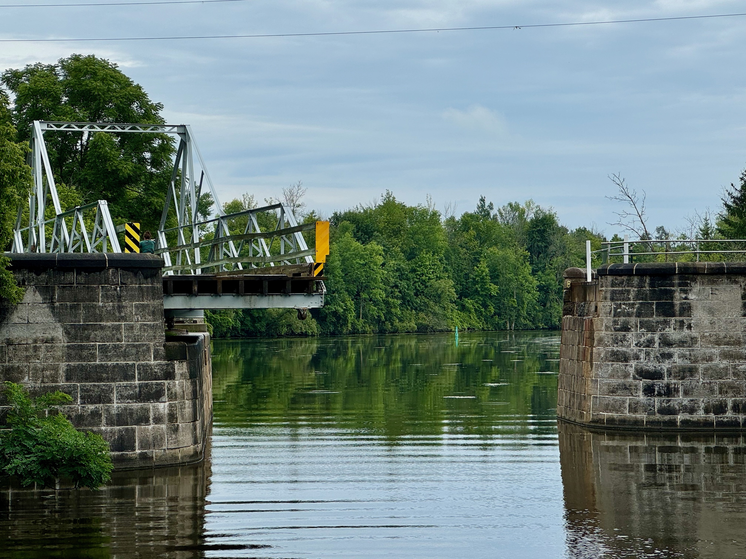 Travel the first three days up to the highest point at Upper Rideau Lake was all about natural beauty. We wound past a wide variety of landscapes. There were low marshlands, fields of lily pads, and tall dense forests on bluffs. At the old Brass Point Spring Bridge a couple young Parks Canada staff did the ‘hamster wheel’ walk in a circle pushing the large crank to swing the bridge open. We passed small, vintage summer cottages with no real towns. Narrow twisting sections with blind turns alternated with wide open marshy areas with fishermen in skiffs waving as we passed.